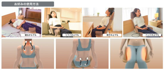 ●基本動作 ・もみ ・背筋伸ばし ・座エアー ●自動コース ・全身 ・肩 ・腰 ●ラチェット機能搭載 ヘッド部分が3段階に調節できる+もみ玉の定位置も調節できる。